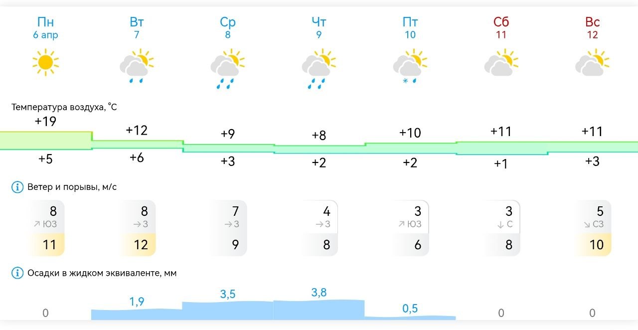 Ветер: в начале и в конце недели порывы до 10–11 м/с. В середине недели слабее (3–4 м/с).