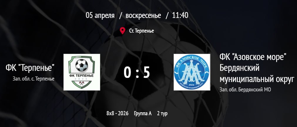 5 апреля в селе Терпенье состоялся матч 2-го тура, в котором встретились ФК «Азовское море» и местный ФК «Терпенье». Первые минуты игры прошли в равной и конкурентной борьбе.