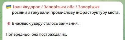В Запорожье прилетПовреждено нежилое здание (офисы), улица Гоголя, 105А. Это здание находится рядом с СБУ.Пострадавших нет. ПОДПИСАТЬСЯ МАХ ЧатБот Дзен