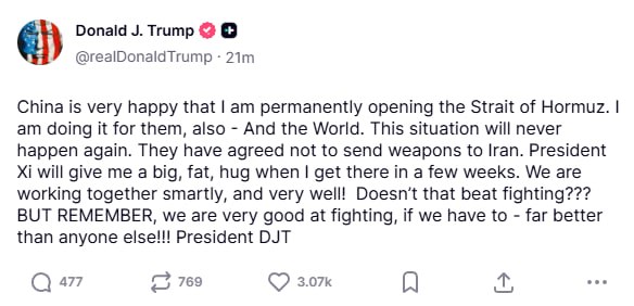 "Китай очень рад, что я окончательно открываю Ормузский пролив. Я делаю это и для них, и для всего мира. Такая ситуация больше никогда не повторится. Они согласились не отправлять оружие в Иран. Президент Си Цзиньпин крепко обнимет меня, когда я приеду туда через несколько недель. Мы работаем вместе умело и очень хорошо! Разве это не лучше, чем сражаться? НО ПОМНИТЕ, что мы очень хорошо умеем сражаться, если придется, - намного лучше, чем кто-либо другой!!!"