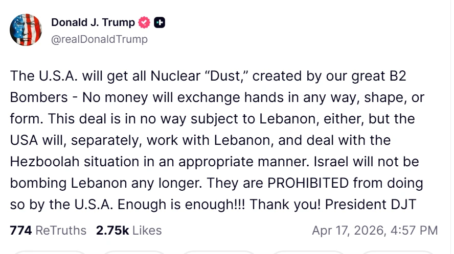 США получат всю ядерную «пыль», созданную нашими великими бомбардировщиками B-2, — никакие денежные средства не будут передаваться ни при каких обстоятельствах. Эта сделка никоим образом не относится к Ливану, однако США отдельно будут работать с Ливаном и надлежащим образом разберутся с ситуацией с «Хезболлой». Израиль больше не будет бомбить Ливан. ЕМУ ЗАПРЕЩЕНО это делать Соединёнными Штатами. Хватит, значит, хватит!!! Спасибо!