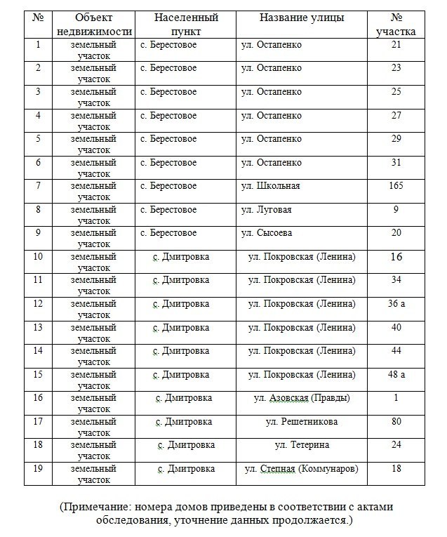 Правообладателям земельных участков (индивидуальное жилищное строительство), а также лицам, использующим земельные участки под ведение личного подсобного хозяйства (ЛПХ), обратится в администрацию Бердянского муниципального округа либо территориального отдела Берестовской/Дмитровской группы сел с подтверждающими документами на собственность этих строений и земельных участков, в срок до 03.05.2026, согласно списку.