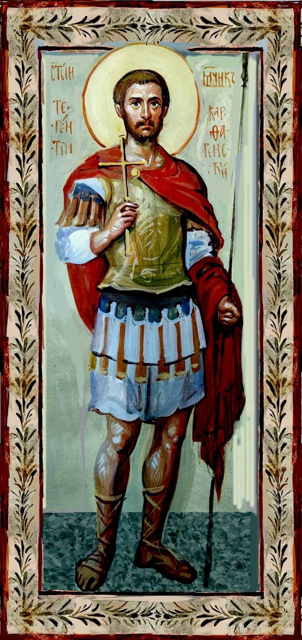 Терентий и его дружина, часть имен которой даже осталась в истории (например, это святые Помпий, Африкан, Максим, Зинон, Александр, Феодор), жили в Карфагене в III веке. Они приняли мученическую смерть при императоре Декии. Тот издал указ, предписывающий всем подданным принести жертву языческим богам. Правитель Африки Фортунатиан, получив этот приказ, созвал весь народ и показал им ужасные пыточные орудия. Многие перепугались и отреклись от христианства, принеся положенные жертвы. Но 40 христиан — Терентий и его дружина — вслух заявили о своей верности Иисусу Христу. Фортунатан сперва попытался вступить с Терентием в богословский спор, но скоро понял, что проигрывает, и что многие встают на сторону Терентия. Тогда он повелел заточить ослушника в тюрьму, туда же были брошены и его ближайшие сподвижники — Африкан, Максим и Помпий. Остальных же воинов их дружины, в том числе Зинона, Александра и Феодора, Фортунатиан, пытался лестью и обманом отречься от веры. Однако, поняв, что ничего не выходит, подверг их мучительным пыткам, но они терпели все, ощущая помощь Господа. Тогда он привел их в храм и потребовал отречься, иначе их убьют. Тогда воины обратились к Богу. И это помогло — Господь услышал их, и идолы рассыпались, а храм разрушился. Тогда правитель разъярился и велел их всех казнить. Мученики приняли смерть от меча палача. Затем он призвал Терентия и его спутников и показал им 36 трупов их воинов. Но все четверо только укрепились в своей вере, тогда их заковали и отправили обратно в застенки, где морили голодом. Но ночью ангел Господень снял с них оковы и кормил их. Потому утром стража нашла их всех четверых здоровыми и отдохнувшими. В их камеру напустили змей, но те не тронули святых. Тогда их лишили голов, а тела их с почестями христиане похоронили за городом.