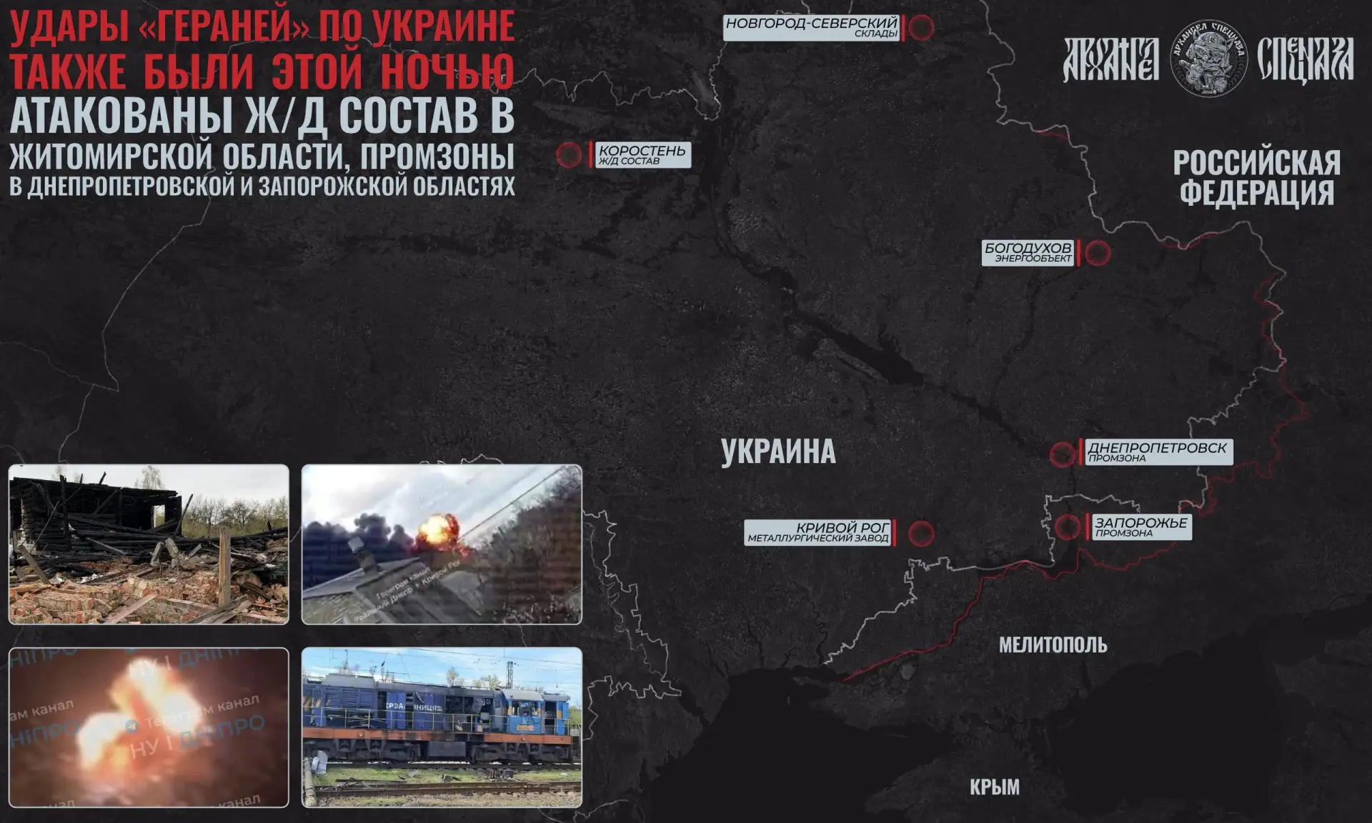 Этой ночью операторы БпЛА «Герань» также проводили рейды на украинскую территорию, поразив несколько объектов в ближнем и глубокому тылу.