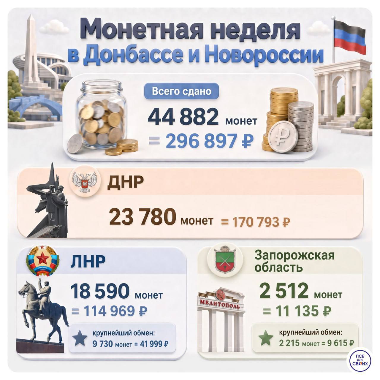 В ЛНР за время акции зафиксировали одну из самых крупных операций: за один раз в банк принесли ~ 10 тысяч монет.