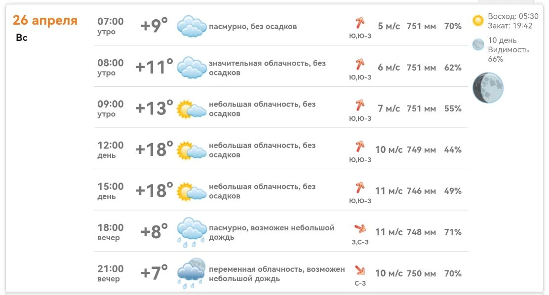 Сегодня 26 апреля, днём до +18°. Утром +9…+13°, к вечеру +7°. Переменная облачность, без осадков, но вечером возможен небольшой дождь. Ветер днём до 10–11 м/с.