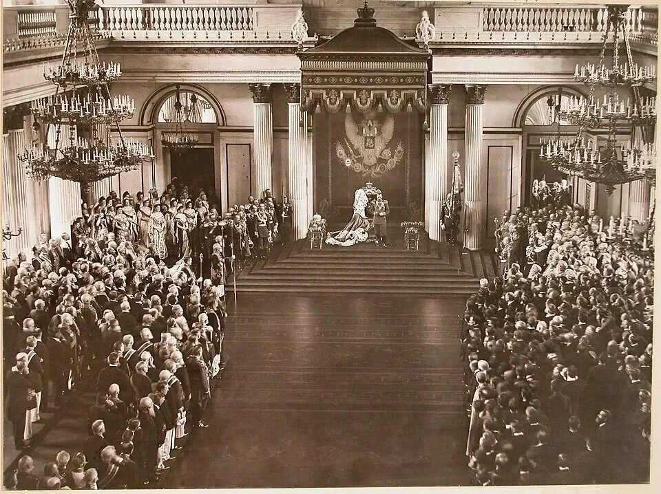 На фото: император Николай II произносит речь в день открытия Первой Государственной Думы в Георгиевском зале Зимнего дворца, 27 апреля 1906 г.