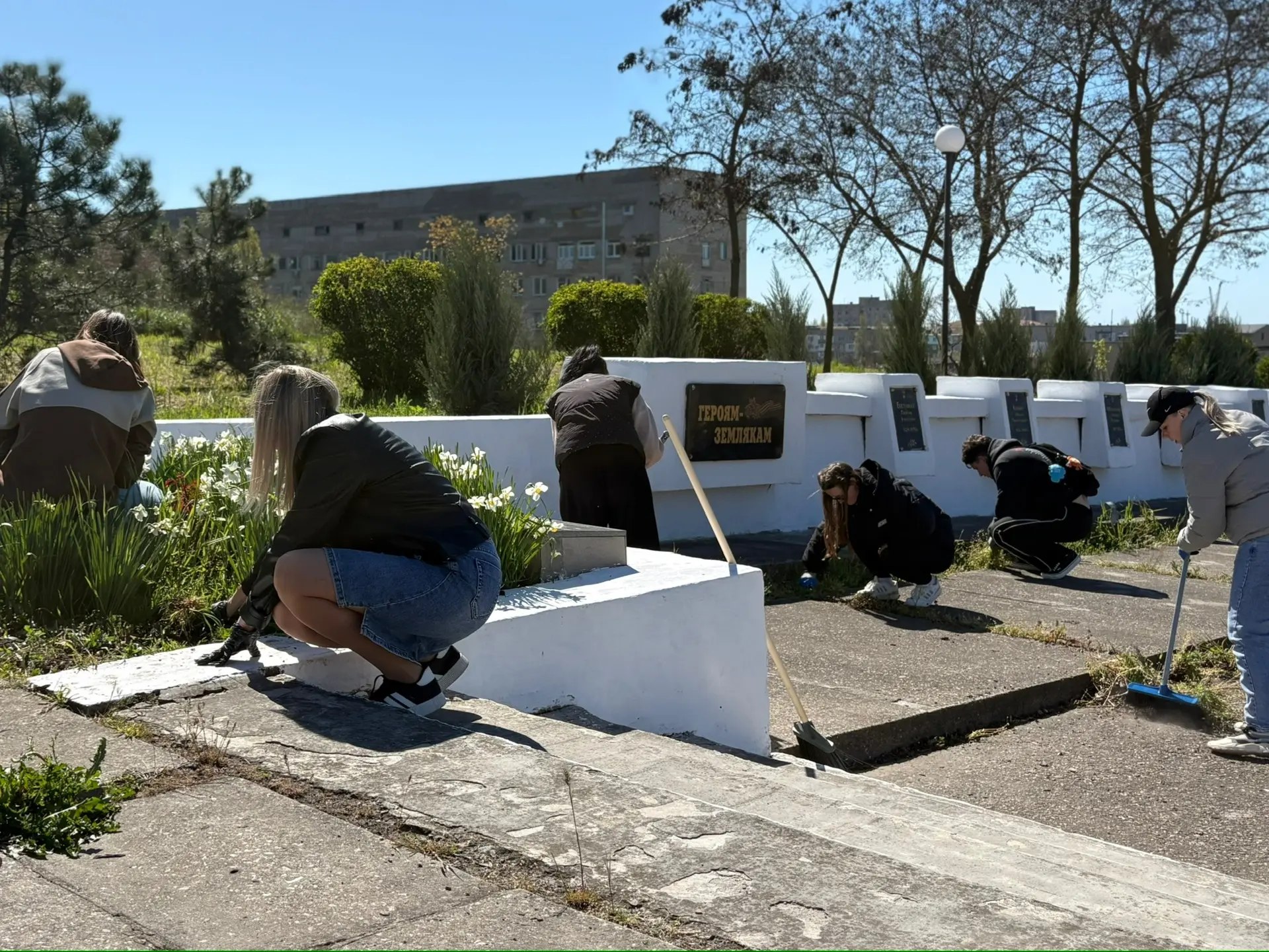 Провести предпраздничную уборку и облагораживание территории мемориального комплекса вышло порядка 50 человек - представители партии «Единая Россия», активисты «Молодой гвардии Единой России», депутаты Бердянского городского Совета, студенты и сотрудники Азовского государственного педагогического университета имени П.Д. Осипенко, а также сотрудники ДК «Нефтехимик».