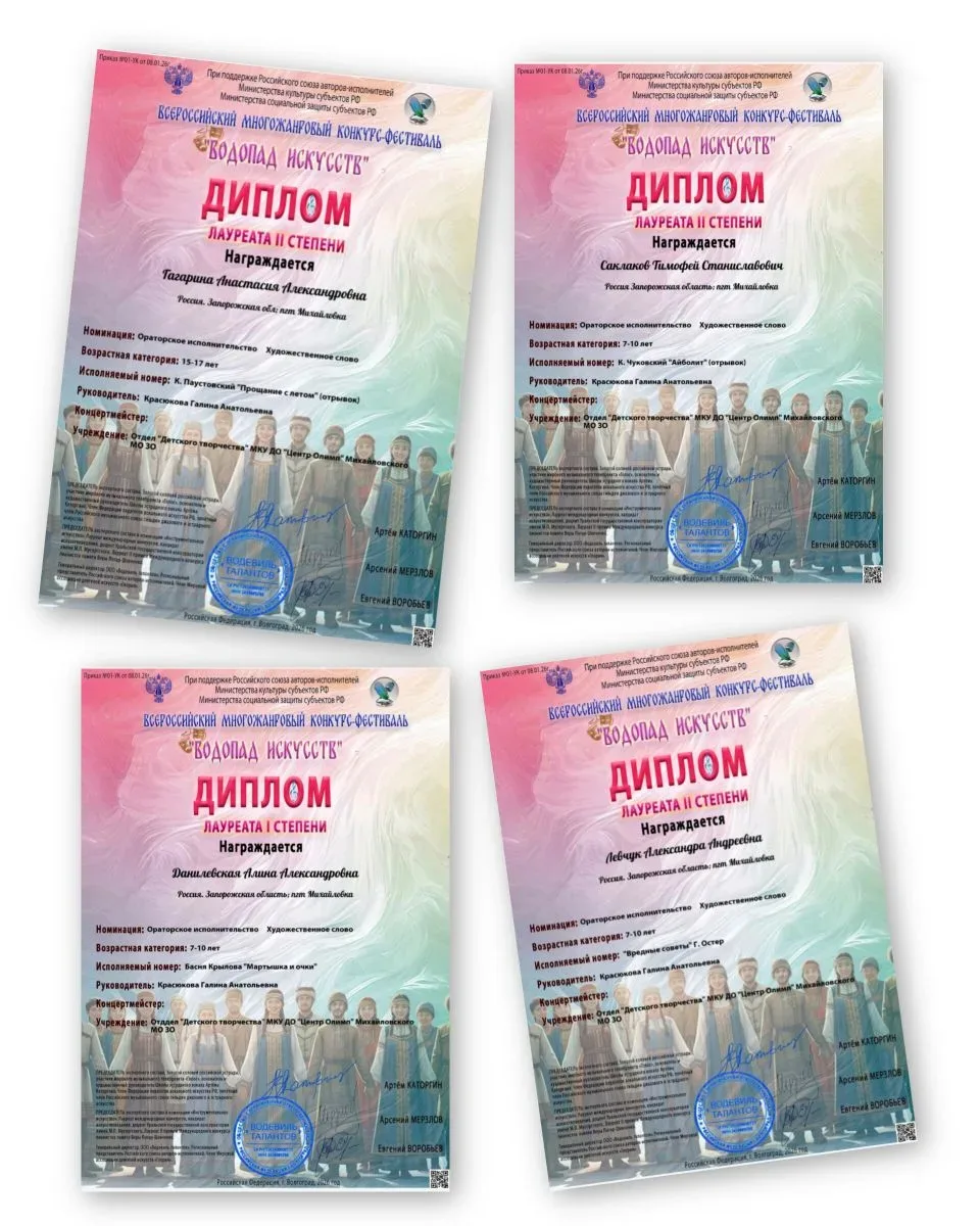 Воспитанники театрального кружка отдела «Детского творчества» МКУ ДО «Центр Олимп» блестяще выступили на III Всероссийском многожанровом фестивале-конкурсе «Водопад искусств» в номинации «Художественное слово», продемонстрировав свой талант и хорошую актерскую подготовку.