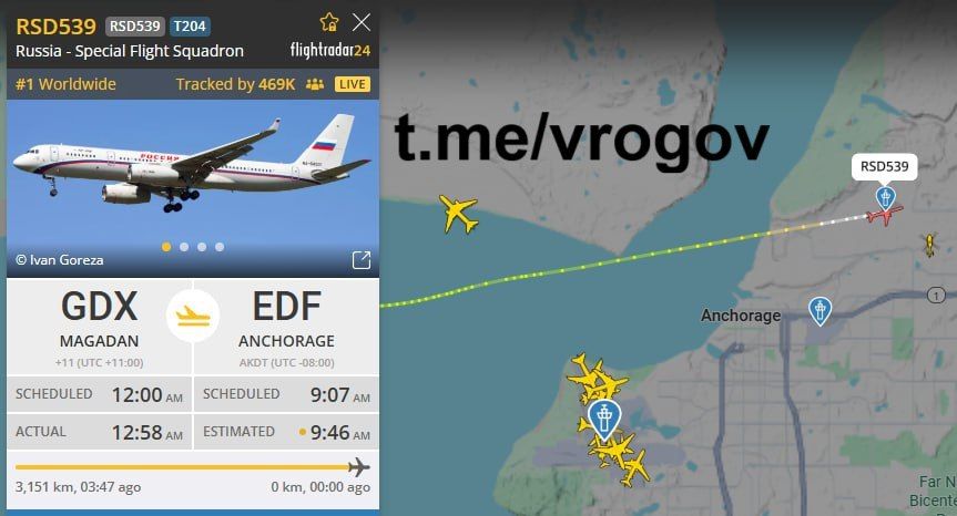470 тысяч человек следили за посадкой в Анкоридже самолёта из авиаотряда «Россия»Предполагалось, что именно на нём на Аляску прилетает Президент России.Но Владимир Путин в этот момент летел на другом борту.Владимир Рогов | Рогов. Глас Народа